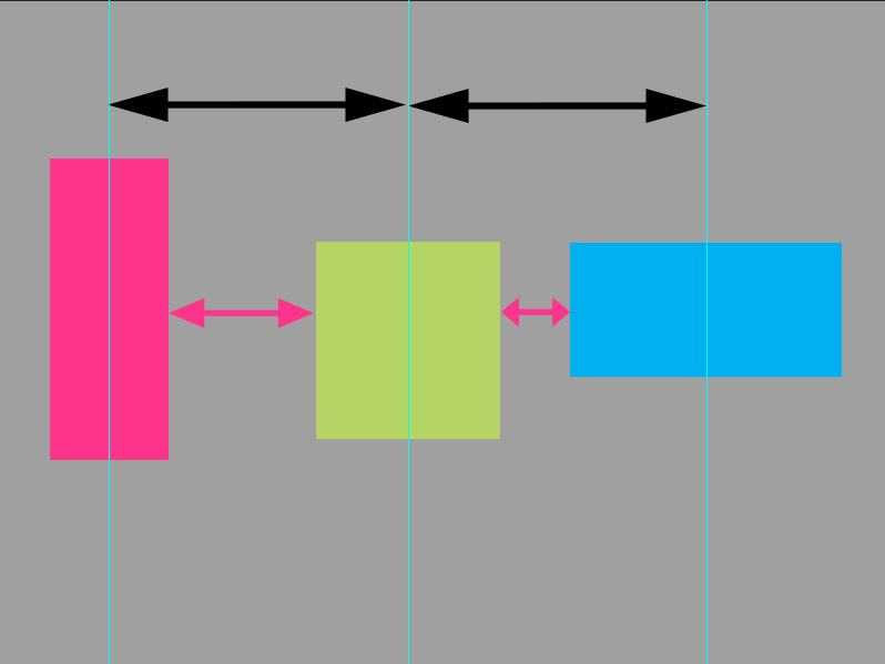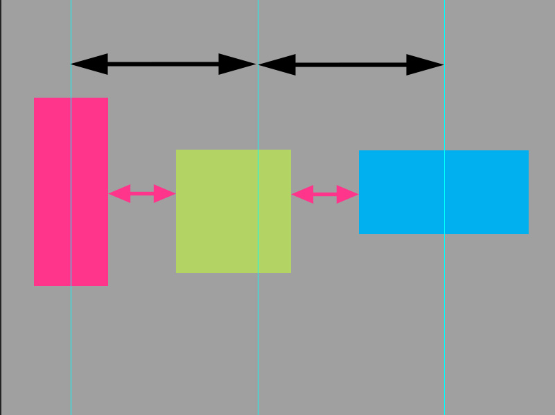 3つのオブジェクトの間隔を図1のようにピンクの矢印の幅を揃えたいけれども図2のようになってしまいます。