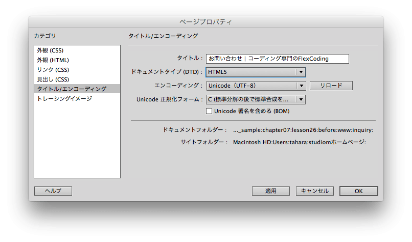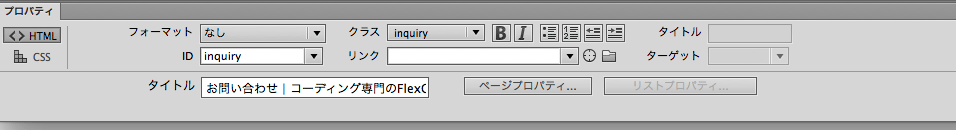 doctypeの変更〜DreamweaverCC HTML&CSS Twitter Facebook はてブ Pocket LINE コピー 2014.11.24 XHTMLなどからHTML5にdoctypeを変更するにはDreamweaverの変換を使用すれば簡単にできる。 CCになってからその機能の場所が変わっていたのでメモ。 CS6の場合はメニューから「ファイル」→「変換」→HTML5 CCでは「ファイル」→「変換」が無くなっている。 同様の機能はプロパティパネルのページ設定のボックスにある。 プロパティパネルの「ページプロパティ」ボタンをクリック 次にカテゴリからタイトル/エンコーディングを選択して、右側のドキュメントタイプを選択