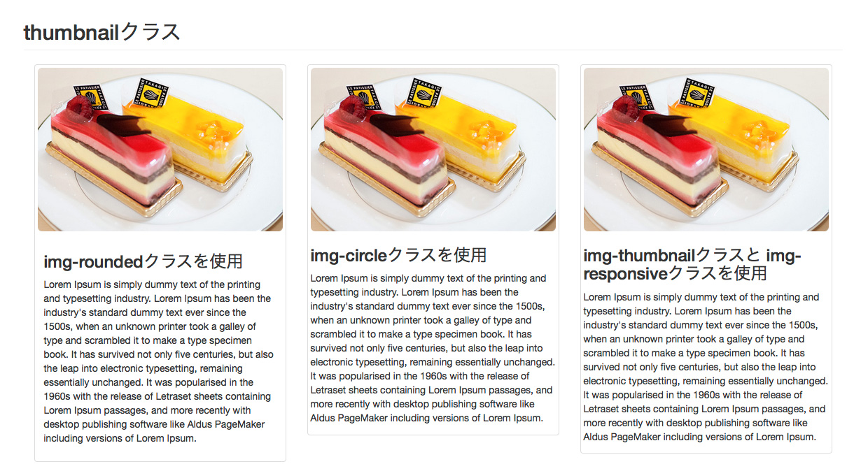このクラスのおもしろいところはthumbnailクラスで囲んだ記事の中にimg要素があると、img-responsiveクラスを使用しなくても画像がちょうど良い大きさに縮小してくれることです。ただし、thumbnailクラスの直接の子供として存在する必要があります。そのためimg要素をp要素などで囲むと縮小表示が適用されません。これはBootstrapのcss設定が.thumbnail > imgをセレクタとしてmax-width: 100%を設定しているからです。