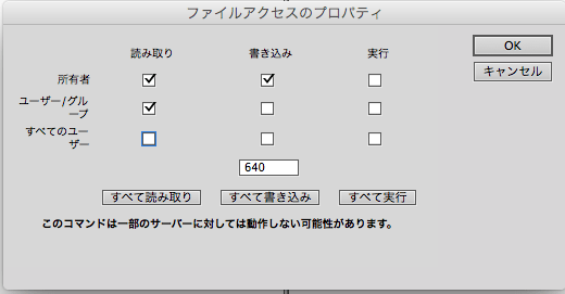 ユーザー、グループ、その他のクラス単位でパーミッションは設定していきます。クラス分けと権限は以下のとおりです。