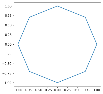 L2_x1 = [1, 0.7071, 0, -0.7071, -1, -0.7071, 0, 0.7071, 1] L2_x2 = [0, 0.7071, 1, 0.7071, 0, -0.7071, -1, -0.7071, 0] import matplotlib.pyplot as plt plt.figure(figsize=(5,5)) plt.plot(L2_x1,L2_x2)